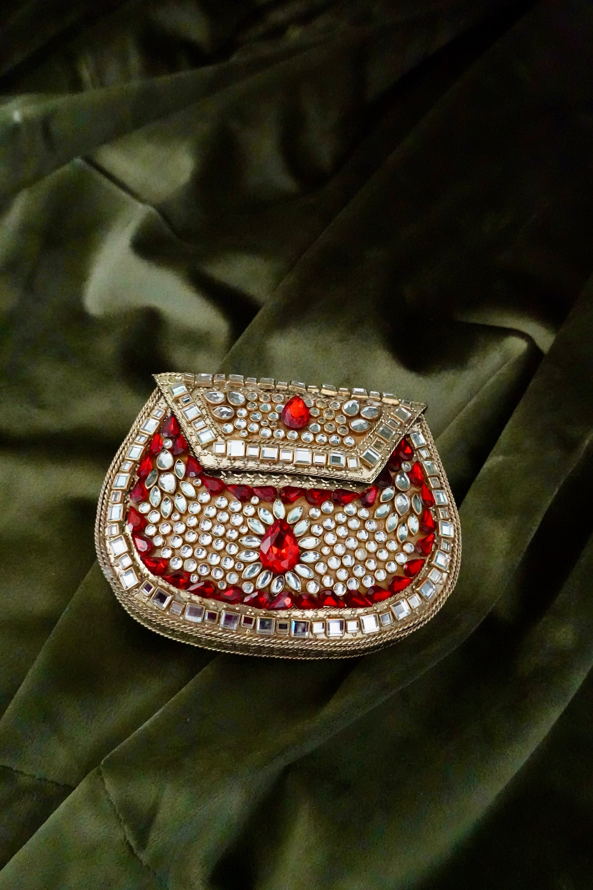 Each of our Kundan Clutches is meticulously handcrafted by skilled artisans. Due to the delicate nature of the materials and the intricate process of hand-placing stones and gems using adhesive, minor variations and imperfections are part of their charm.